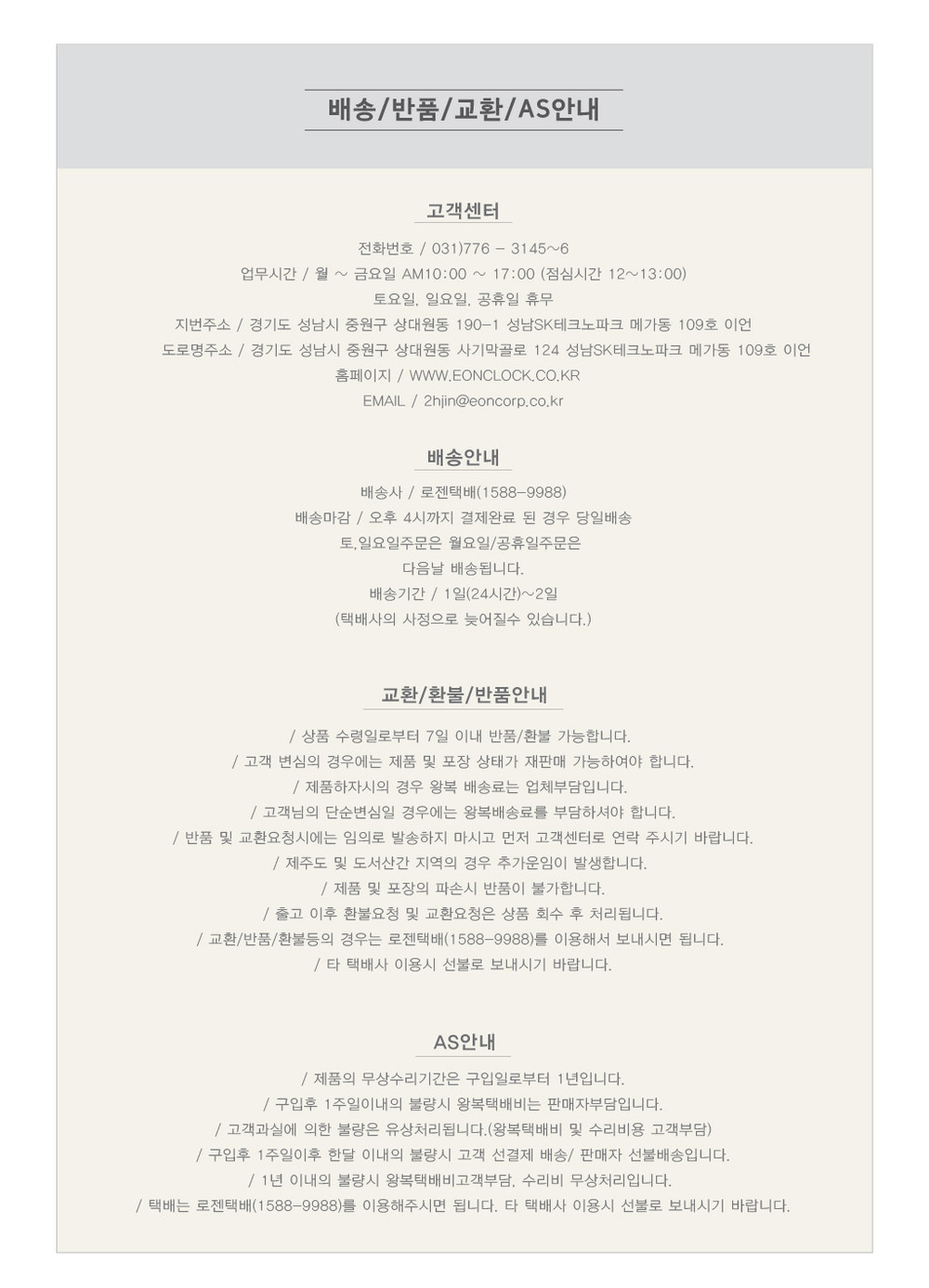 > 반품이나 교환시에는 당사 고객센터와 통화 후 진행하여 주시기 바랍니다.